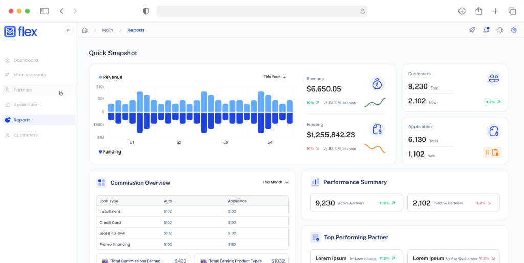 Track loan applications and approvals in real time. Customize financing promotions to drive conversions. Generate reports on financing impact and sales growth.